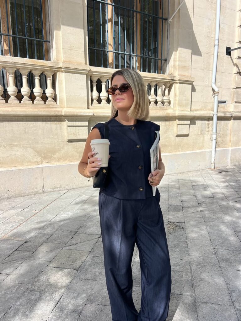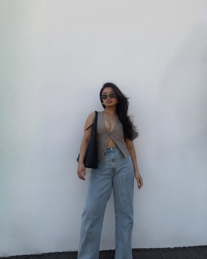 A taupe buttoned knit vest styled with light-wash wide-leg denim creates a soft, neutral-toned look that feels modern and airy. This combination is ideal for business-casual days or hybrid work environments where comfort and polish need to coexist. The knit vest adds texture and structure, while the denim keeps the outfit effortlessly cool. It’s a simple yet refined look that transitions well from work hours to relaxed evening plans.