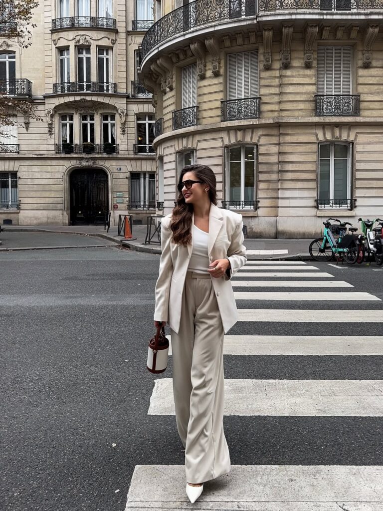 This outfit pairs the timeless structure of a cream tailored blazer with the fluid elegance of wide-leg satin trousers, creating a look that feels both powerful and soft. The combination offers a refined silhouette that works beautifully for formal offices, client presentations, or even creative workspaces where polished simplicity is appreciated. The blend of tailored structure and satin movement ensures comfort throughout long workdays while offering a modern, fashion-forward twist that stays professional without feeling too rigid.