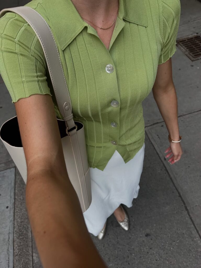 This fresh and vibrant outfit pairs a lime knit button-up with an ivory satin midi skirt for a refined yet playful look. The bold top introduces color into the workday, while the satin skirt softens the overall appearance with elegant movement. This outfit works well for offices that welcome creative expression and modern styling. It’s comfortable enough for long work hours but polished enough to maintain a professional presence.