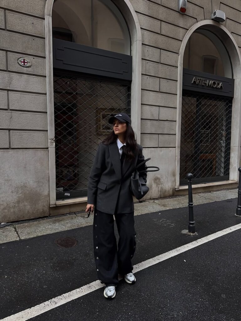 This outfit centers around a charcoal oversized blazer paired with wide-leg trousers featuring subtle snap detailing for an unexpected twist. The monochromatic palette creates a streamlined, powerful silhouette that works beautifully in minimalist or modern work environments. The relaxed fit ensures comfort during long hours, while the snap details introduce a touch of personality. It’s an excellent choice for days when you want to look fashion-forward while remaining workplace-appropriate.
