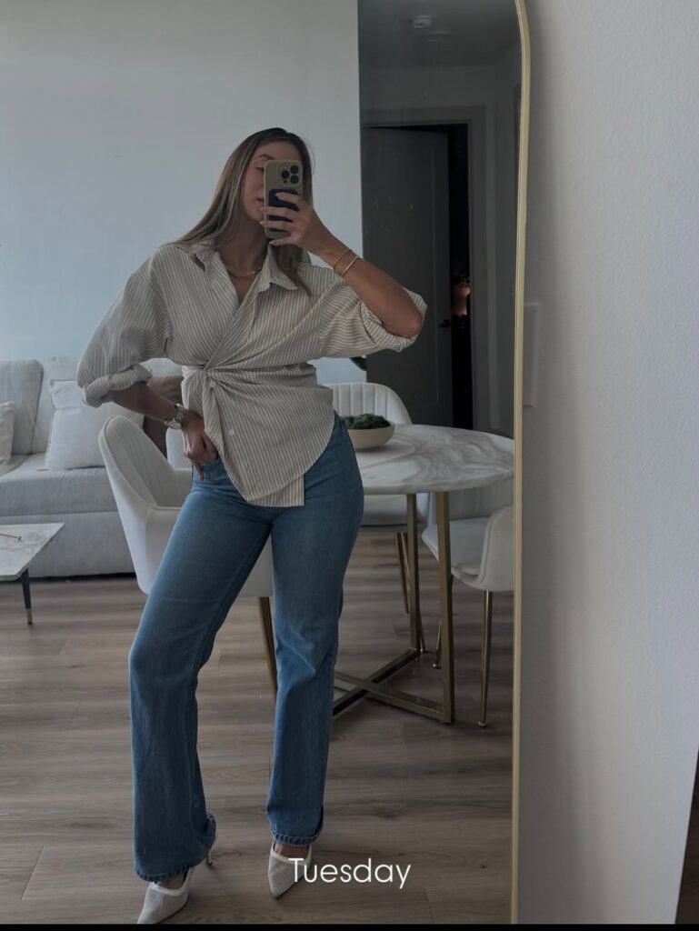 A striped wrap shirt paired with classic straight-leg denim creates a modern business-casual look that feels polished yet approachable. The wrap silhouette adds structure and enhances the waistline, while the denim keeps things relaxed enough for creative or casual professional settings. This outfit is perfect for team lunches, casual Fridays, or days when you need versatility. It combines comfort with intentional styling, making it easy to move through your day with confidence and ease.