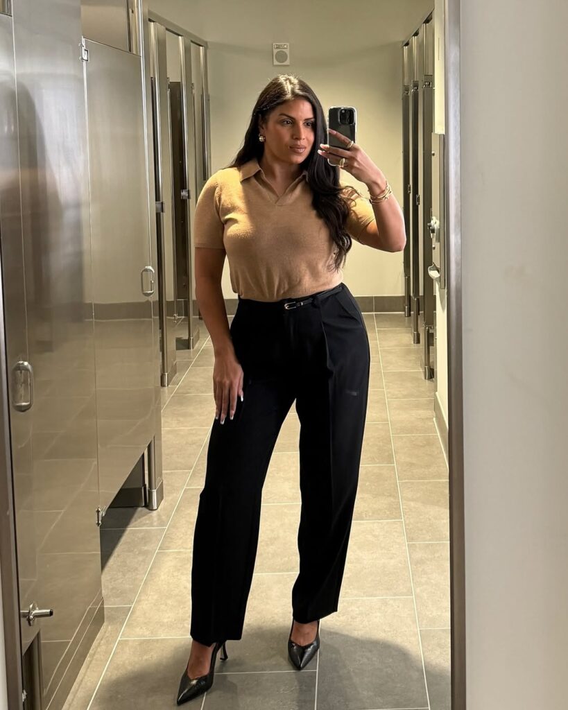 Combining a chocolate knit polo with high-waisted tailored trousers creates a warm, rich-toned outfit perfect for fall or winter office days. The knit polo brings softness and comfort, while the structured trousers maintain a professional edge. This pairing works for both business-casual environments and more traditional workplaces, offering a put-together appearance without sacrificing ease of movement. It’s the kind of look that feels relaxed yet intentional, ideal for busy weeks when comfort and polish must coexist.