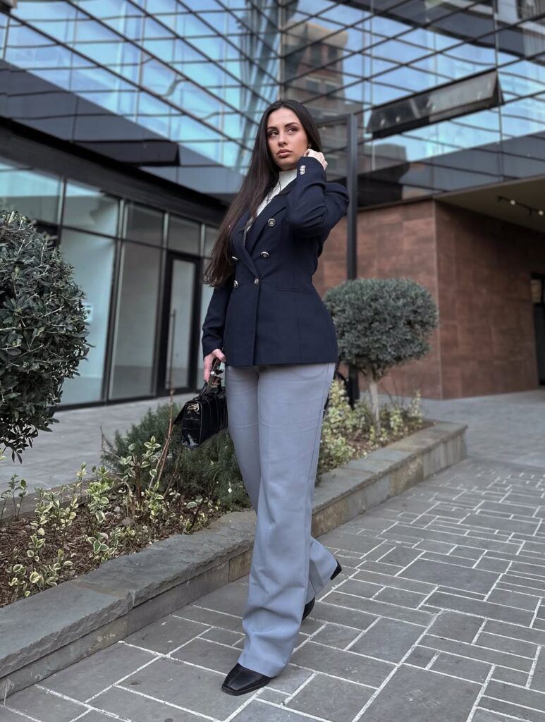 This structured look pairs a navy blazer with slate tailored trousers for a muted, contemporary take on the traditional office suit. The mix of cool-toned neutrals creates a sleek and cohesive appearance without feeling overly formal. It’s ideal for corporate settings or presentations where you want to appear sharp and relaxed at the same time. The structured blazer ensures polish, while the comfortable trousers allow mobility, making the outfit both practical and impeccably styled.