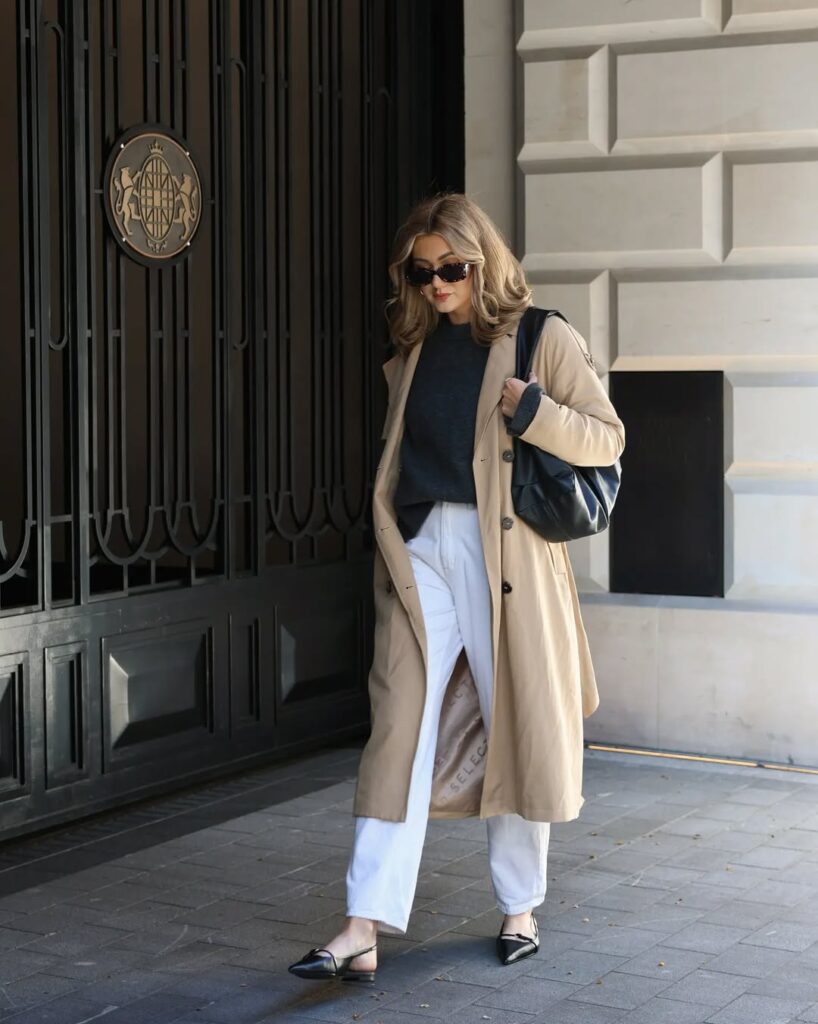 This layered combination pairs a classic camel trench with a charcoal knit and crisp white trousers for an elevated, timeless palette. Perfect for transitional weather, this outfit keeps you comfortable on commutes while maintaining a polished appearance inside the office. The mix of warm and cool tones creates a balanced and sophisticated look that works in both corporate and semi-casual settings. It’s one of those effortlessly chic ensembles that always feels appropriate.