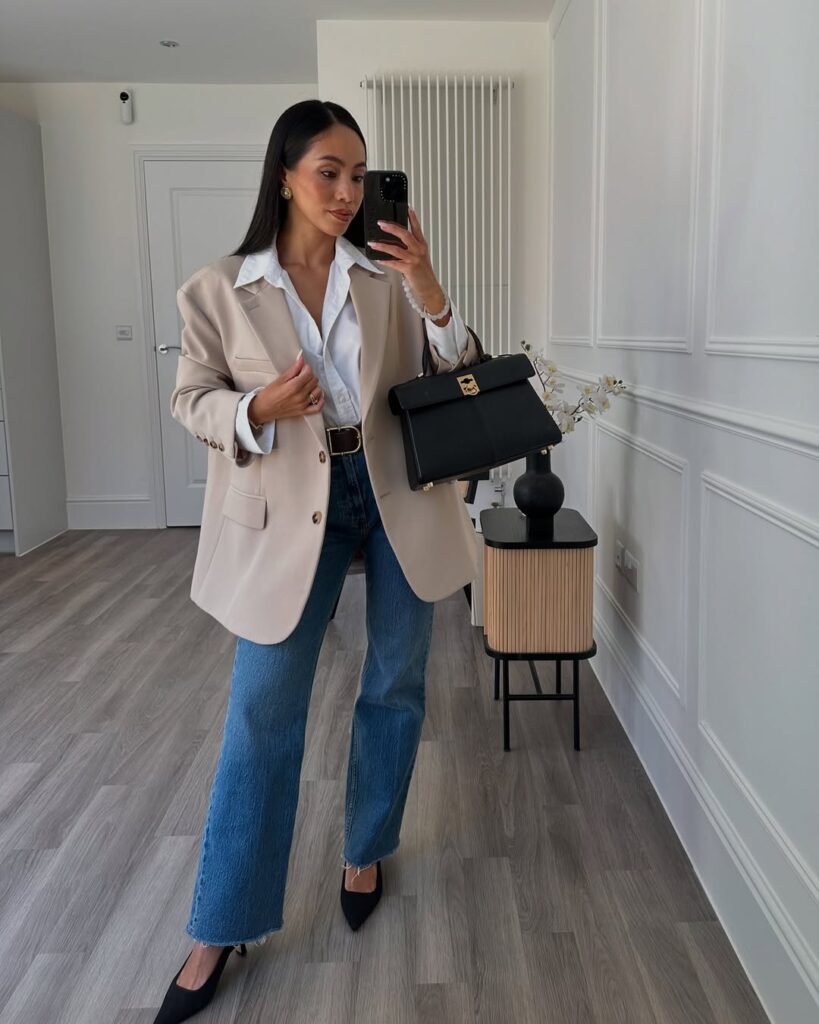 9. Beige Oversized Blazer with Crisp White Shirt and Raw-Hem Denim