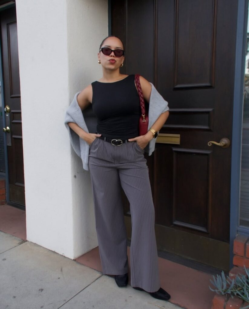 Pairing a charcoal ribbed tank with pinstripe wide-leg trousers creates a clean, architectural silhouette ideal for warm office days or layered cooler seasons. The ribbed tank brings texture and breathability, while the pinstripe trousers maintain professional structure. This outfit works particularly well in creative, editorial, or business-casual environments where minimalist styling is appreciated. It balances softness and sharpness beautifully, offering comfort without sacrificing sophistication.