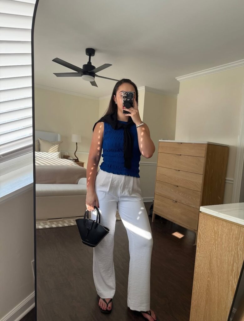 18. Cobalt Smocked Top with Crisp White Linen Trousers