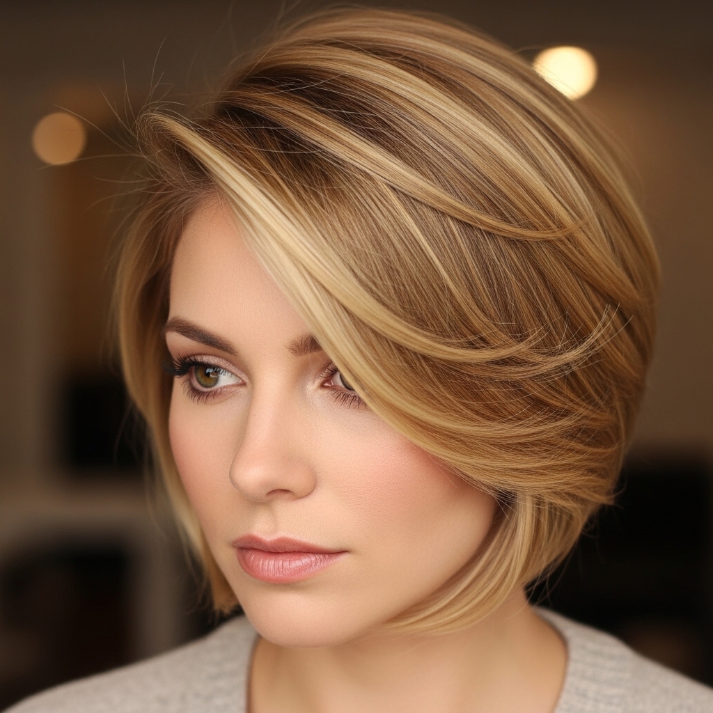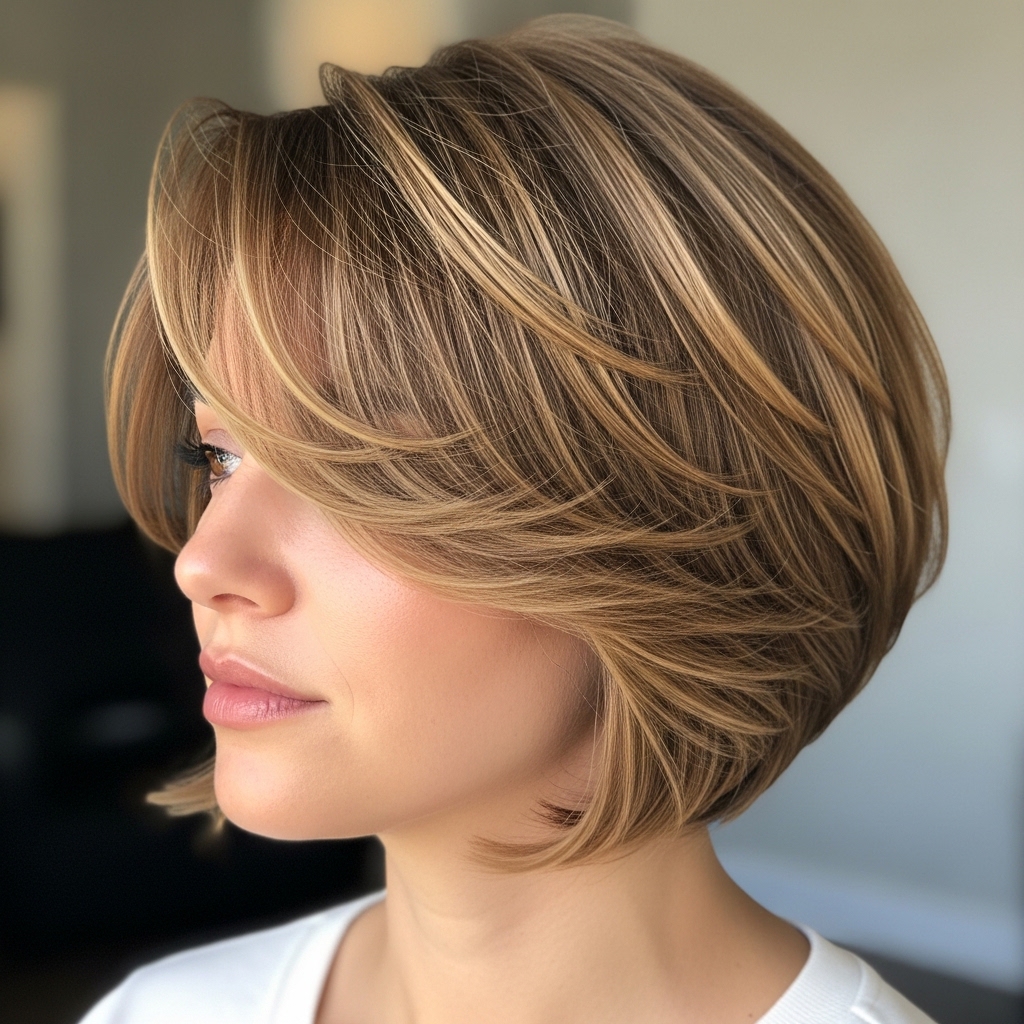 Featuring a deep side part and sweeping layers, this bixie exudes sophistication and movement. The asymmetry adds visual interest while elongating the face, making it a flattering choice for many face shapes. It is suitable for both formal occasions and elevated everyday wear.
