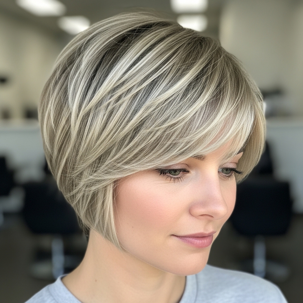 This style combines a classic bixie shape with a bold blunt fringe that adds instant personality. The fringe sits straight across the forehead, contrasting with the softer layers around the sides and back. It is ideal for fashion events, editorial-inspired looks, or anyone seeking a statement hairstyle.