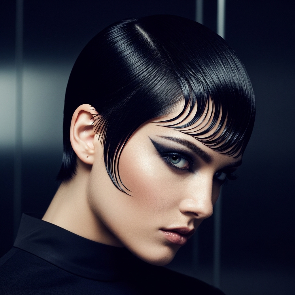 This dramatic bixie is styled with a wet-look finish, giving it a bold and editorial appearance. The hair is slicked back or molded into shape, emphasizing the cut’s structure. It is perfect for evening events, photoshoots, or high-fashion moments.