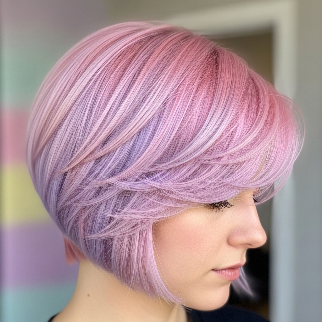 This bixie introduces subtle pastel tones blended seamlessly into the hair, adding a playful yet sophisticated twist. The soft hues enhance the layered structure without overpowering it. It is ideal for creative expression and seasonal trend updates.