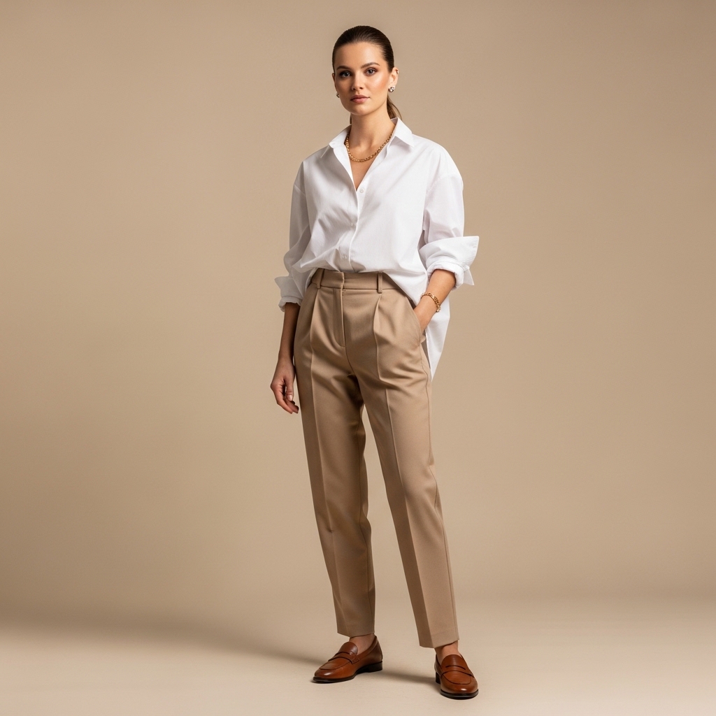 A crisp white shirt styled with relaxed trousers or skirts creates a clean and modern aesthetic. It can be worn slightly oversized, tucked, or layered over a tank. Suitable for work or casual settings, this look feels timeless yet current. The breathable cotton fabric ensures comfort, while the structured shape adds polish. Its versatility makes it an essential piece that adapts to multiple styling needs.