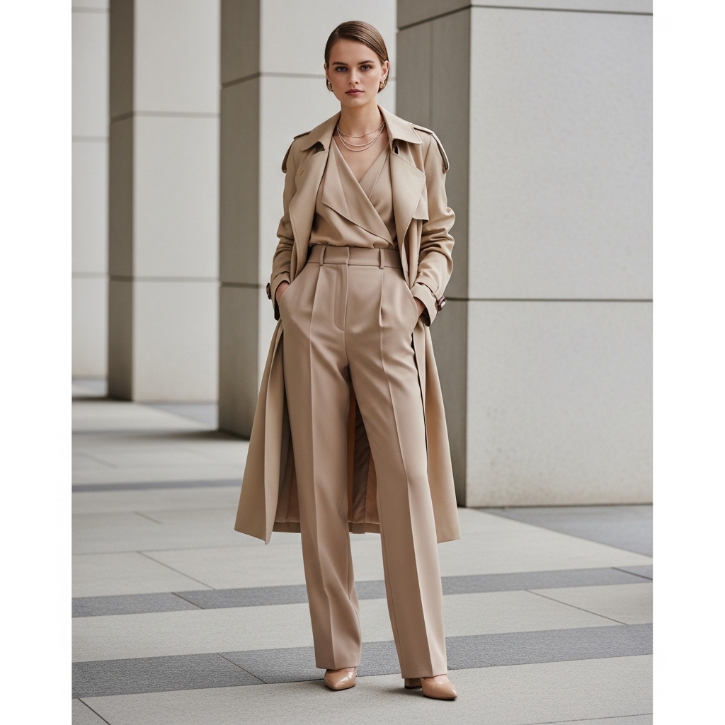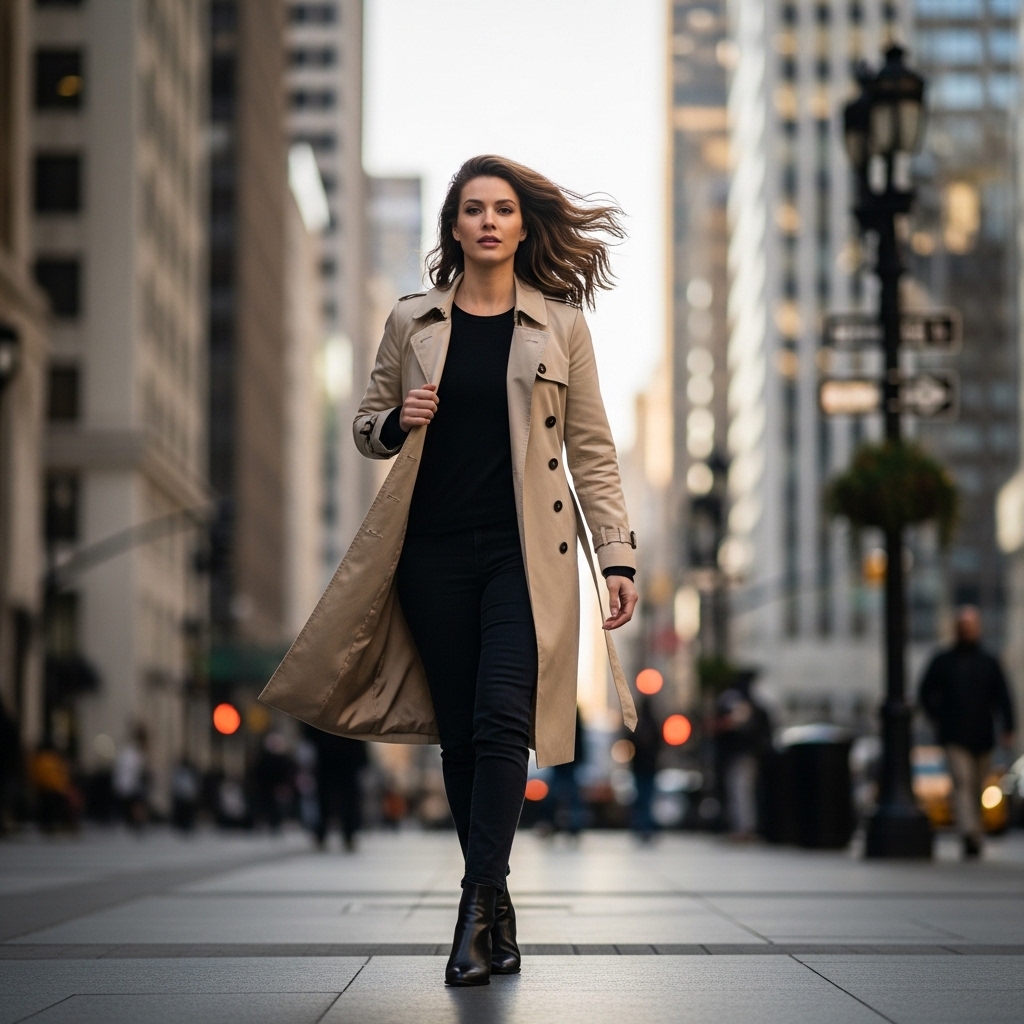 A statement trench coat layered over simple basics transforms an everyday outfit into something elevated. Whether worn over jeans or dresses, it adds structure and sophistication. Perfect for transitional weather, it provides warmth without heaviness. The balance lies in pairing a bold outer layer with minimal inner pieces.