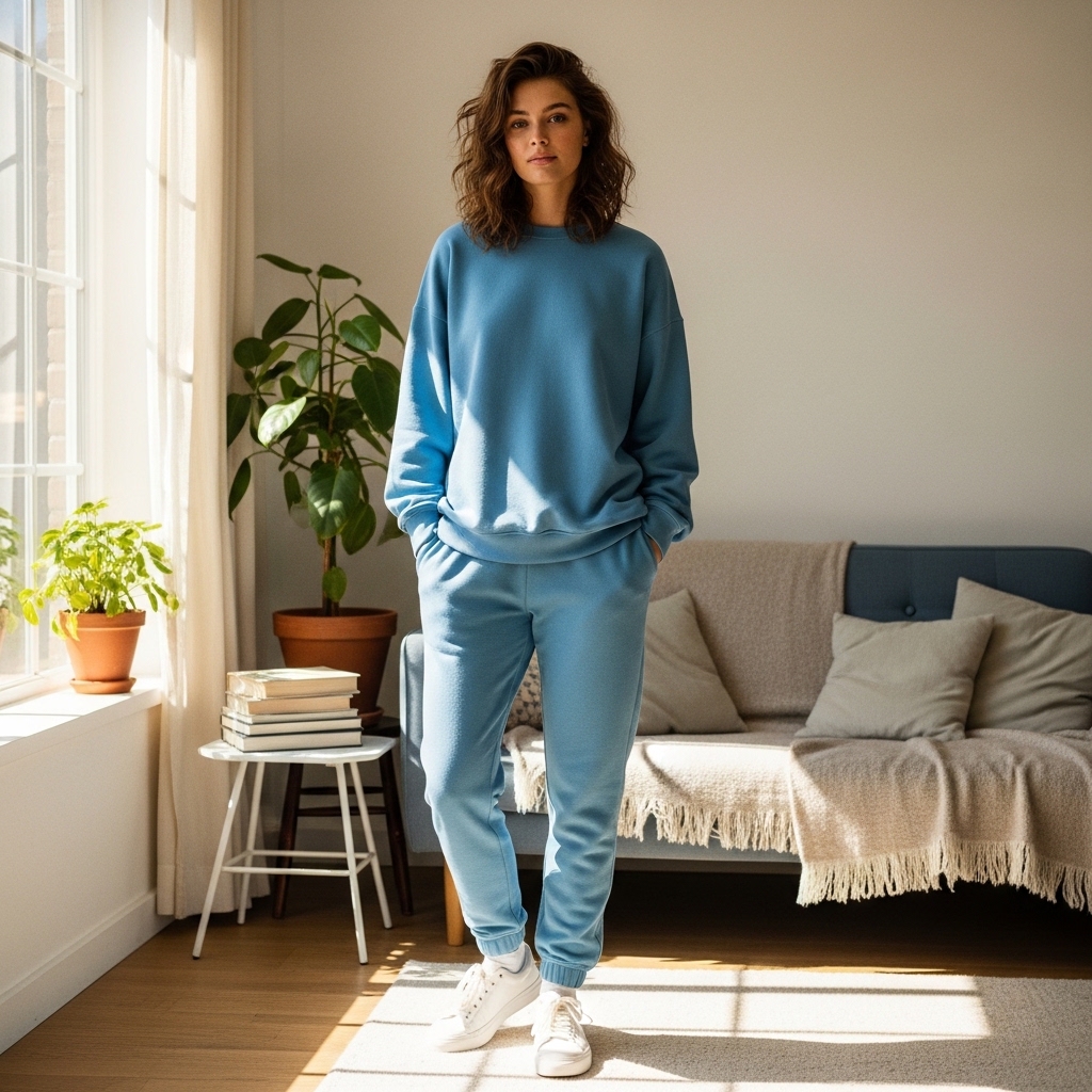 A pastel lounge set in soft fabrics offers comfort without sacrificing style. Coordinated tops and bottoms in shades like lavender or mint create a cohesive look. Ideal for travel, relaxed days, or casual outings, this outfit feels modern and easy. The soft fabric ensures comfort, while the matching tones keep it visually appealing.