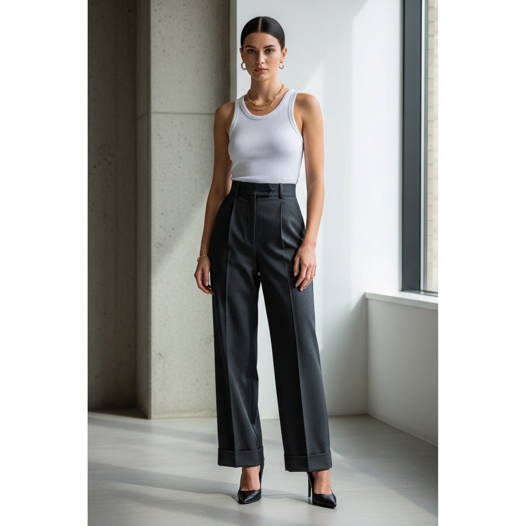 A ribbed tank top paired with tailored trousers creates a sleek and modern outfit. The fitted top contrasts with the structured pants, creating a balanced silhouette. Suitable for casual workdays or outings, it feels both practical and refined. The breathable fabric ensures comfort, while the clean lines keep it stylish.