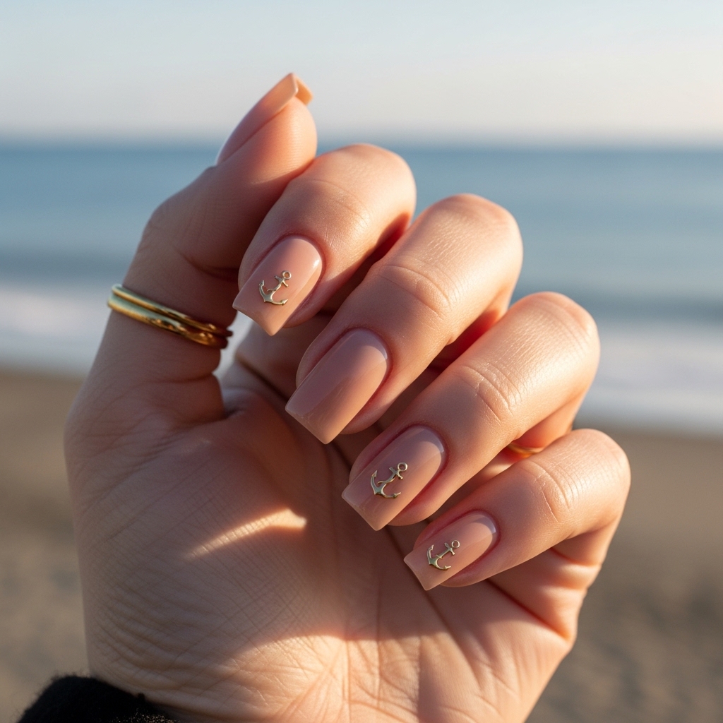 This style combines a warm nude base with delicate gold anchor accents placed on one or two nails. The metallic detail adds a refined touch without overpowering the overall look. It is perfect for vacations, yacht-inspired events, or casual spring evenings. The neutral base keeps the design versatile and wearable, while the subtle embellishment introduces a hint of luxury. It offers a balance between understated comfort and eye-catching detail.