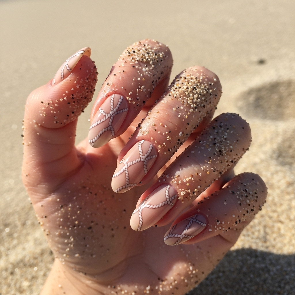 This intricate design features soft beige or sand-toned nails with delicate rope-inspired patterns drawn in slightly darker shades. The texture mimics the look of nautical ropes, adding depth and interest. Ideal for themed gatherings or stylish daywear, it offers a unique yet subtle aesthetic. The neutral palette ensures versatility and comfort, while the detailed art keeps it fashion-forward.