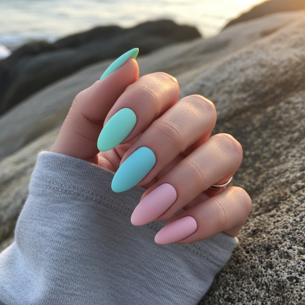 This look uses muted pastel shades inspired by sea glass, finished with a matte topcoat for a soft, diffused effect. Colors such as pale aqua, mint, and blush are layered or alternated across nails. Perfect for casual spring days or creative settings, it feels light and refreshing. The matte finish enhances comfort by reducing glare, while the color palette keeps it trendy and visually appealing.