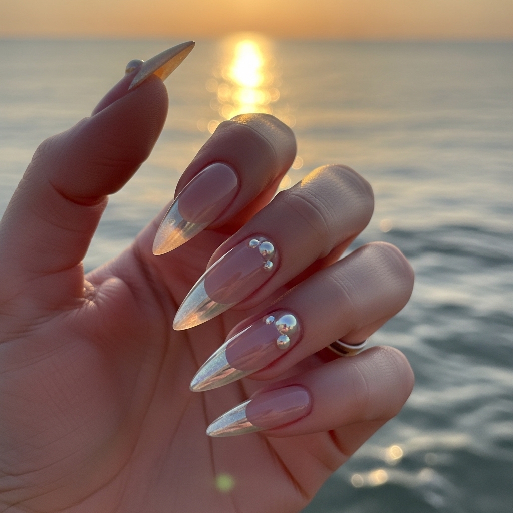 This design incorporates iridescent finishes that mimic the shimmer of seashells, often applied as tips or subtle overlays. The base remains neutral, allowing the reflective quality to stand out. Ideal for evening events or special occasions, it adds a touch of elegance and glamour. Despite its luminous effect, the design remains lightweight and wearable, balancing comfort with a luxurious aesthetic.