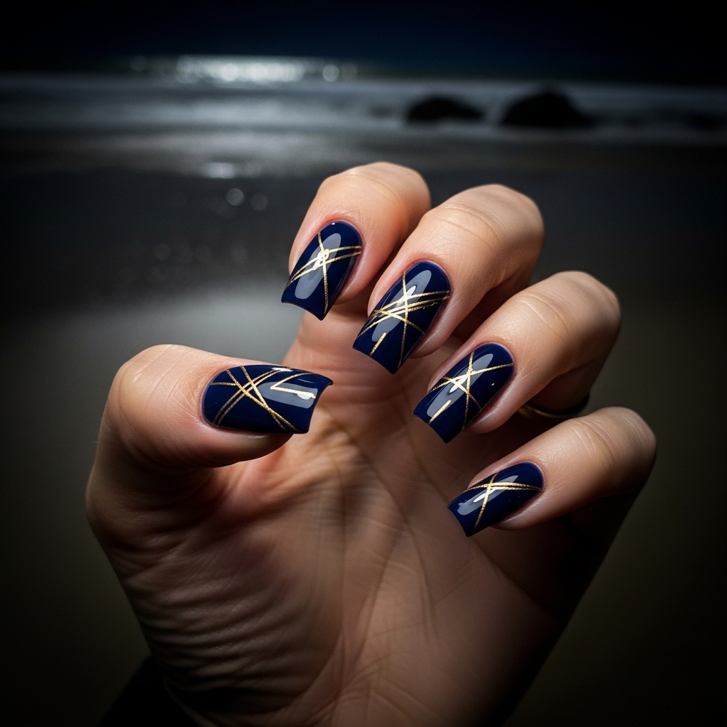 This bold design features a rich navy or deep blue base accented with thin metallic lines in gold or silver. The contrast creates a striking yet polished look. Suitable for night events or upscale gatherings, it delivers sophistication with a modern edge. The glossy finish ensures smooth wear, while the metallic details add just enough drama to stay on trend.