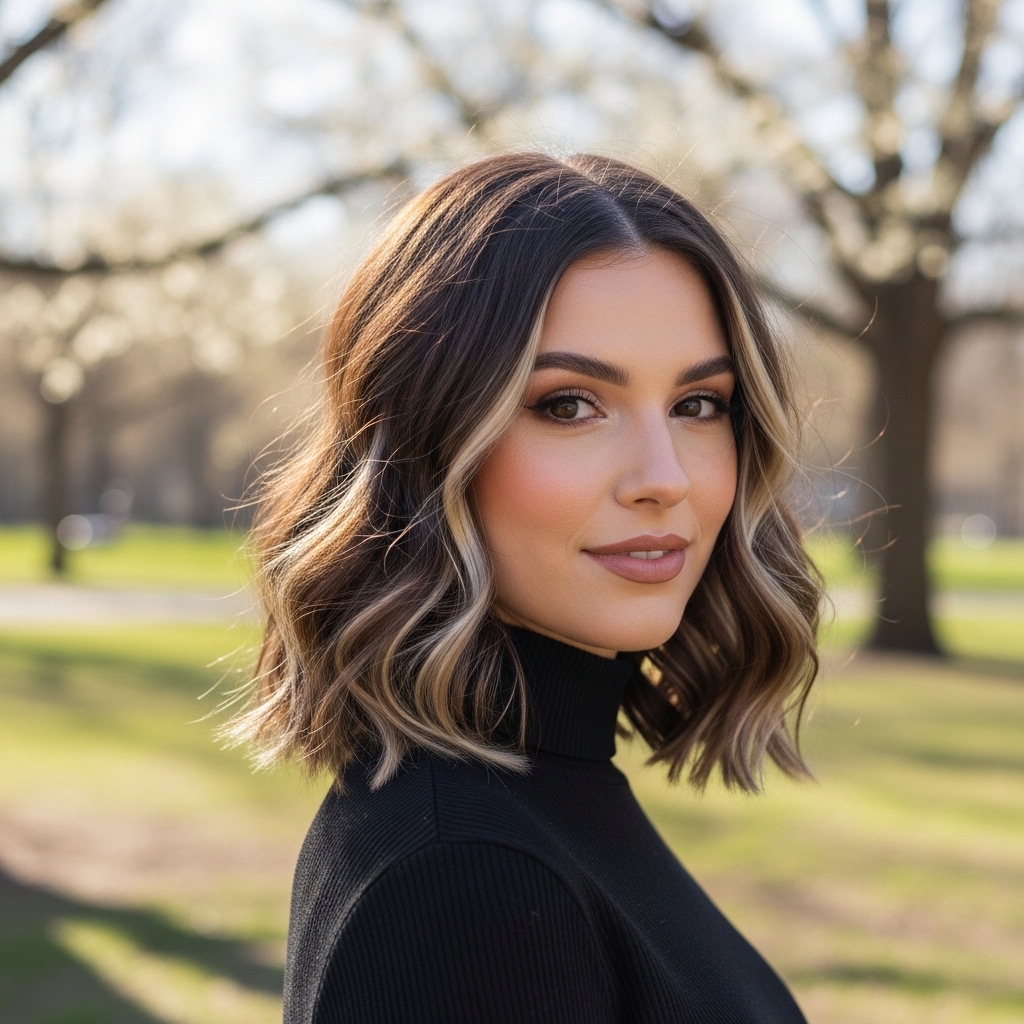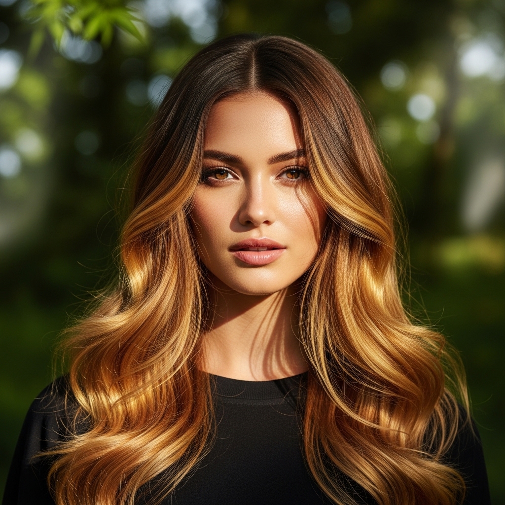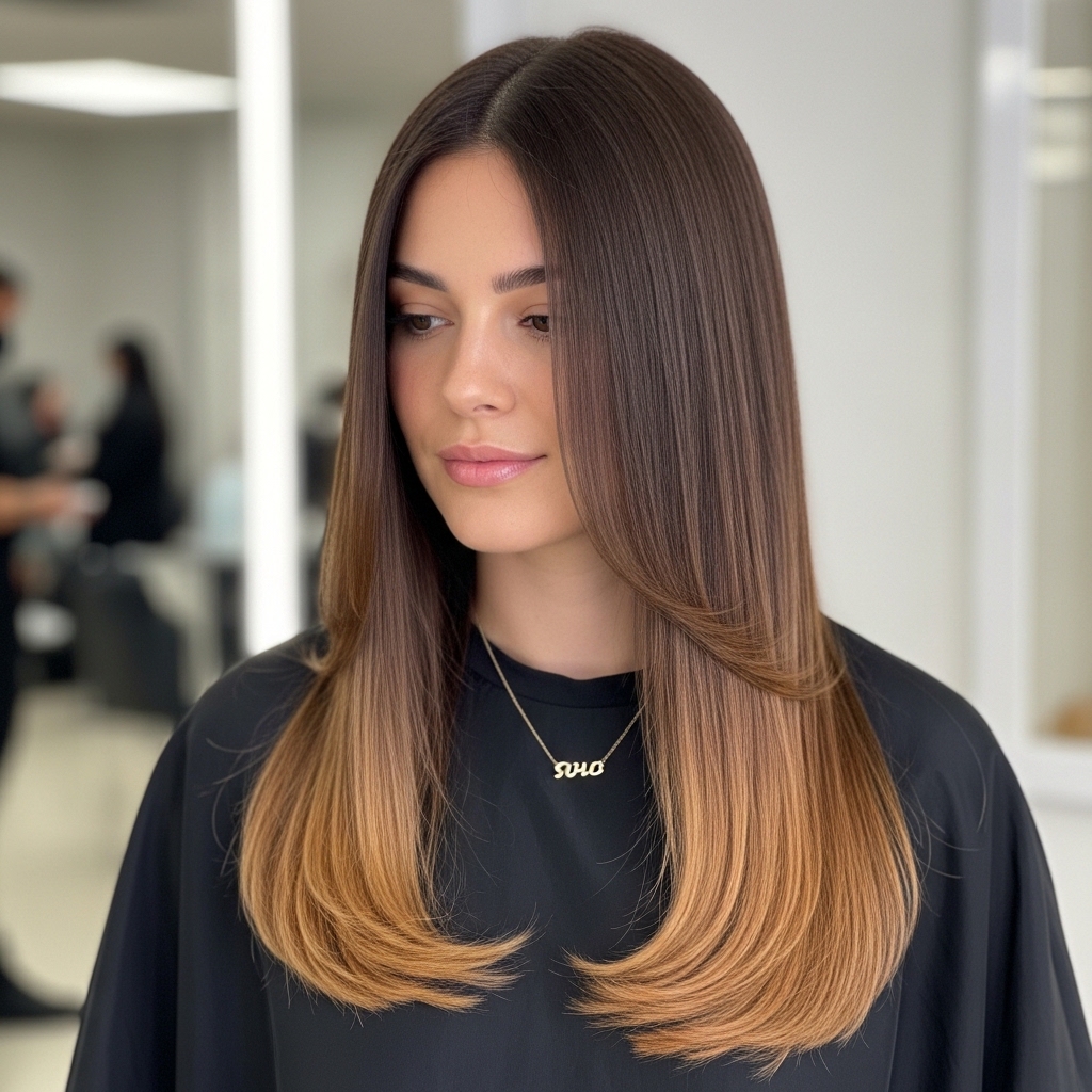 This look features a rich brunette base enhanced with softly painted blonde ribbons that flow naturally through the lengths. The highlights are placed to mimic how the sun would naturally lighten the hair, creating a seamless blend. It is ideal for everyday wear, professional settings, or casual outings, offering versatility without frequent maintenance. The contrast remains gentle, ensuring the look feels natural rather than dramatic. It balances comfort and trend by allowing longer time between salon visits while still delivering dimension and brightness.
