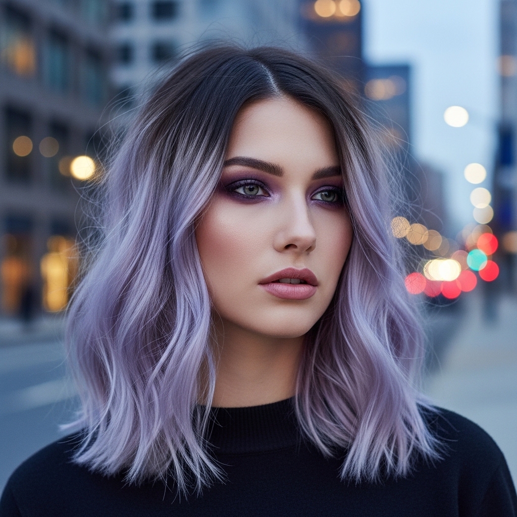 A subtle touch of smoky lavender is blended into a neutral base, creating a unique yet wearable look. The color appears soft and muted, making it suitable even for more conservative settings. It offers a creative twist while remaining understated. The balayage technique ensures the color fades gently, maintaining comfort and ease of upkeep.