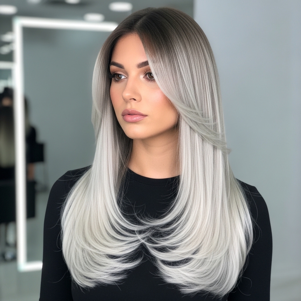 Icy platinum tones are blended into a soft gradient, creating a cool and luminous finish. This look feels bold yet refined, offering a high-fashion edge. It is perfect for special occasions or those who enjoy making a statement. Despite its striking appearance, the balayage technique ensures a smoother grow-out, balancing style with practicality.