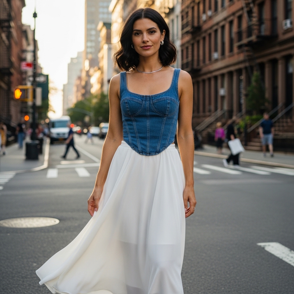 A structured denim corset paired with a flowy midi skirt creates a balanced look that blends casual and elevated elements. The corset adds shape and a fashion-forward edge, while the skirt keeps the outfit relaxed and wearable. This combination is ideal for casual birthday outings or city strolls. It reflects current trends that mix structured pieces with soft silhouettes. Comfort comes from the breathable fabrics, while the design keeps the outfit stylish and fresh.
