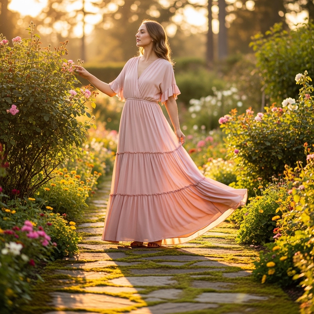 A flowing maxi dress with layered ruffles adds movement and drama while still feeling soft and wearable. In shades like peach or soft lavender, this outfit captures the essence of spring celebrations. It is ideal for outdoor dinners or evening gatherings. The ruffles create visual interest without compromising comfort, making it both eye-catching and easy to wear. This trend leans into feminine styling with a modern twist.