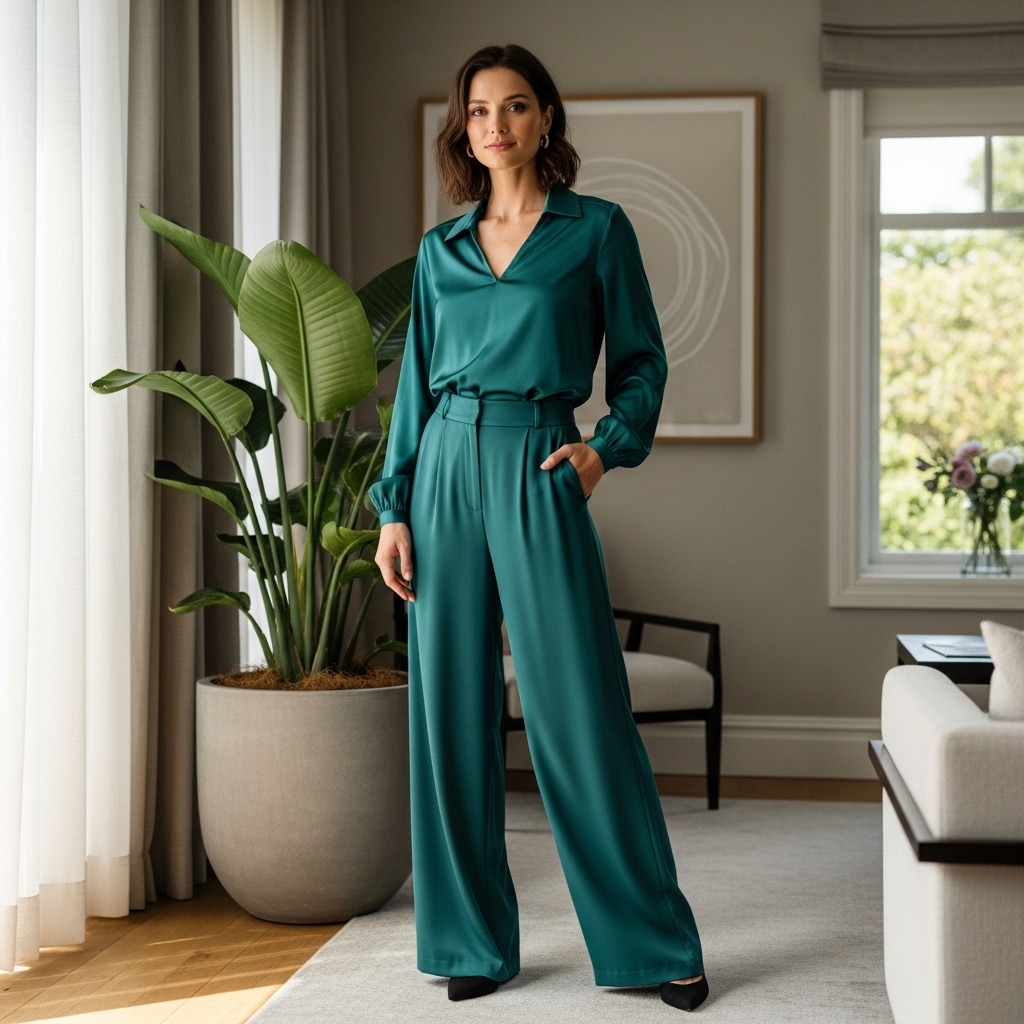 A silky satin blouse paired with high-waisted wide-leg trousers creates an effortlessly elegant outfit. This combination works well for evening dinners or semi-formal gatherings. The smooth texture of the blouse contrasts beautifully with the structured trousers. It offers comfort through loose-fitting pieces while maintaining a refined appearance. This trend reflects a shift toward polished yet relaxed styling.