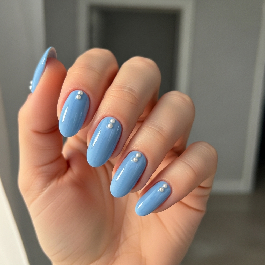 This look features a soft baby blue base paired with tiny pearl embellishments for a refined yet playful finish. The glossy topcoat enhances the color while highlighting the delicate details.