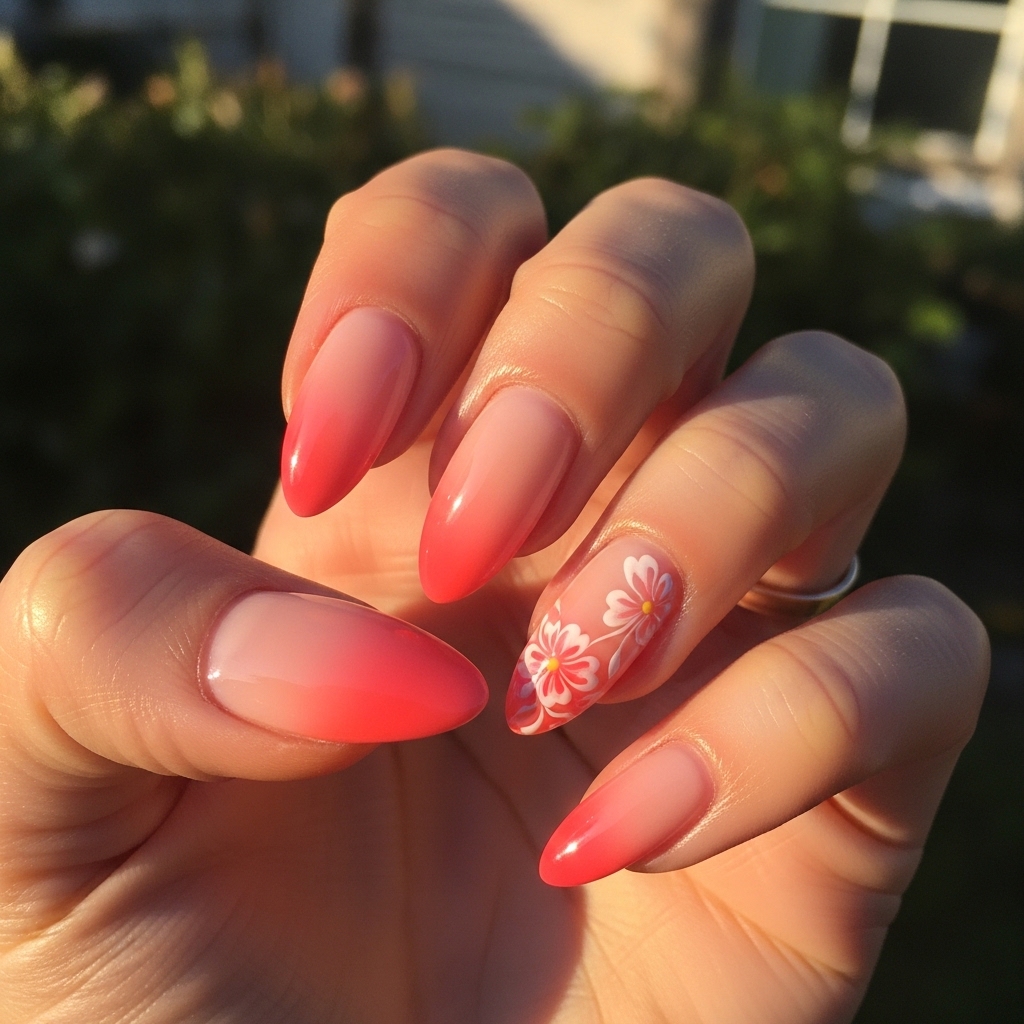 Glossy Coral Ombre Almond Nails