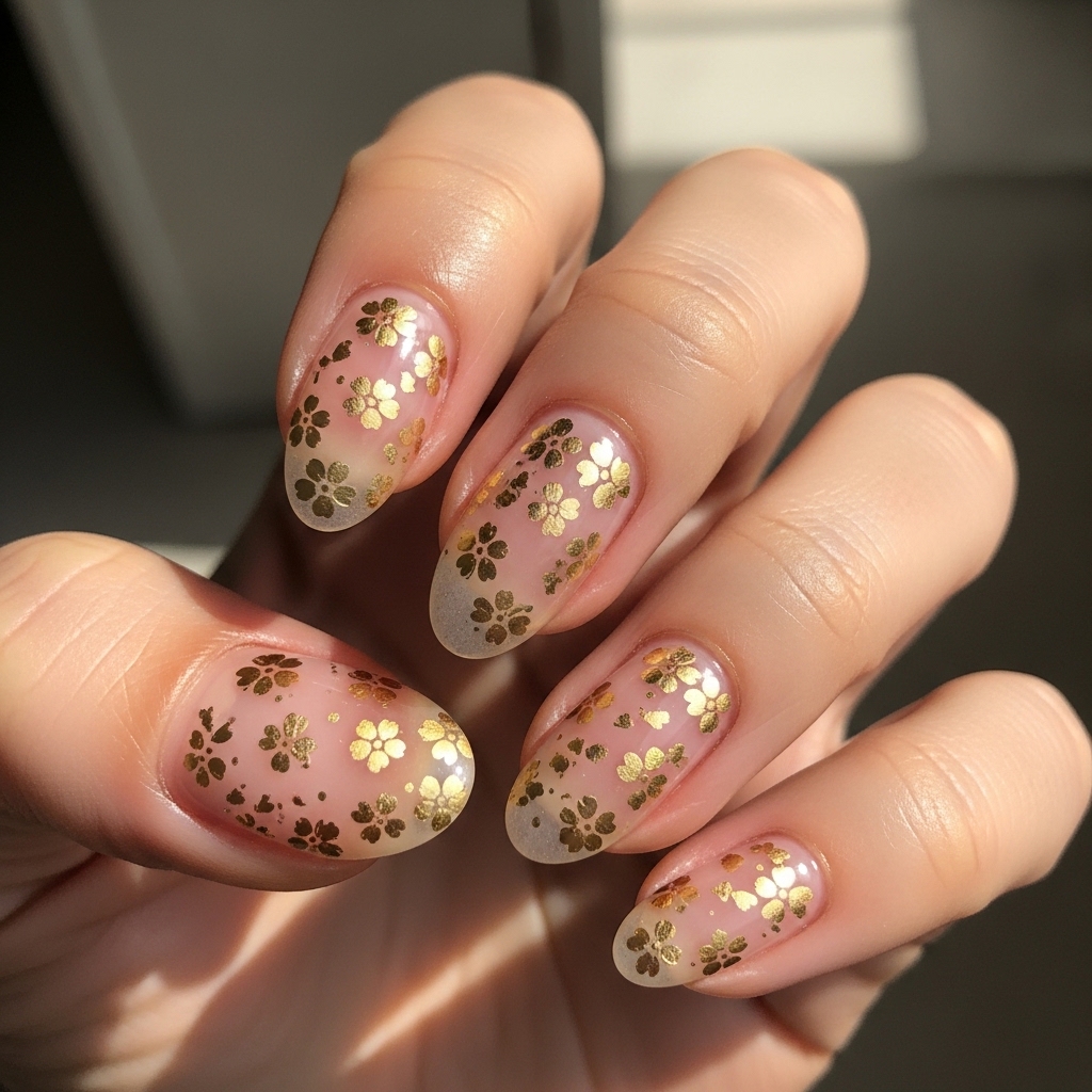 A delicate sheer pink base is elevated with subtle gold foil accents placed sporadically across the nails. The effect is soft, luminous, and effortlessly chic without feeling overly decorative.