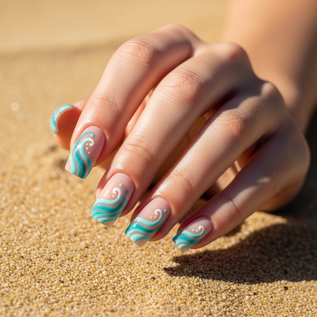 Aqua Blue Waves Minimal Nail Art