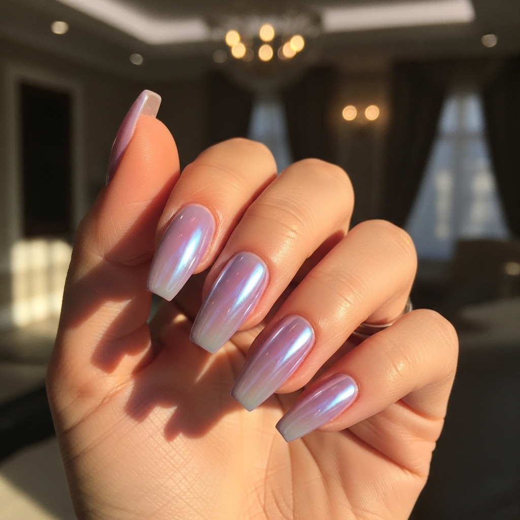 This manicure combines a muted lavender tone with a subtle chrome overlay that reflects light beautifully. The finish is smooth and mirror-like while still maintaining a soft color presence.