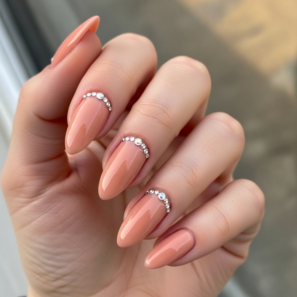 A warm peach nude base is enhanced with tiny gem embellishments placed near the cuticle or along one accent nail. The design remains clean while adding just the right amount of sparkle.