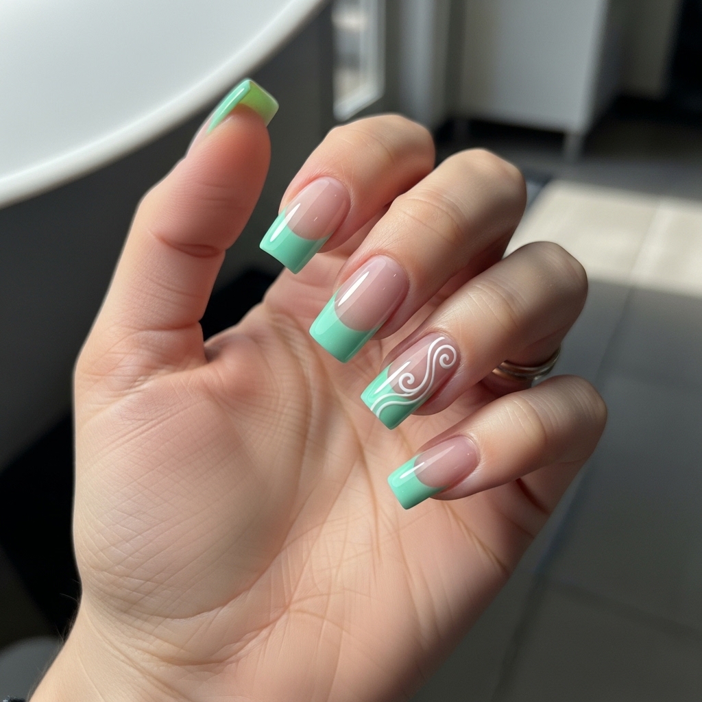 This design features mint green tips paired with delicate swirl patterns in white or slightly darker green tones. The combination creates a fresh and playful yet refined appearance.