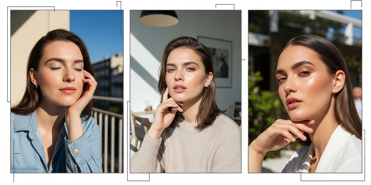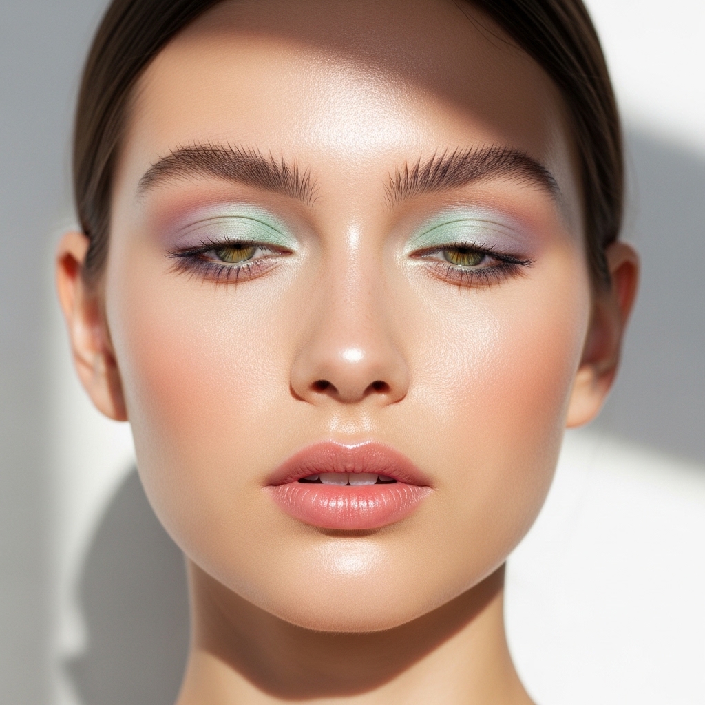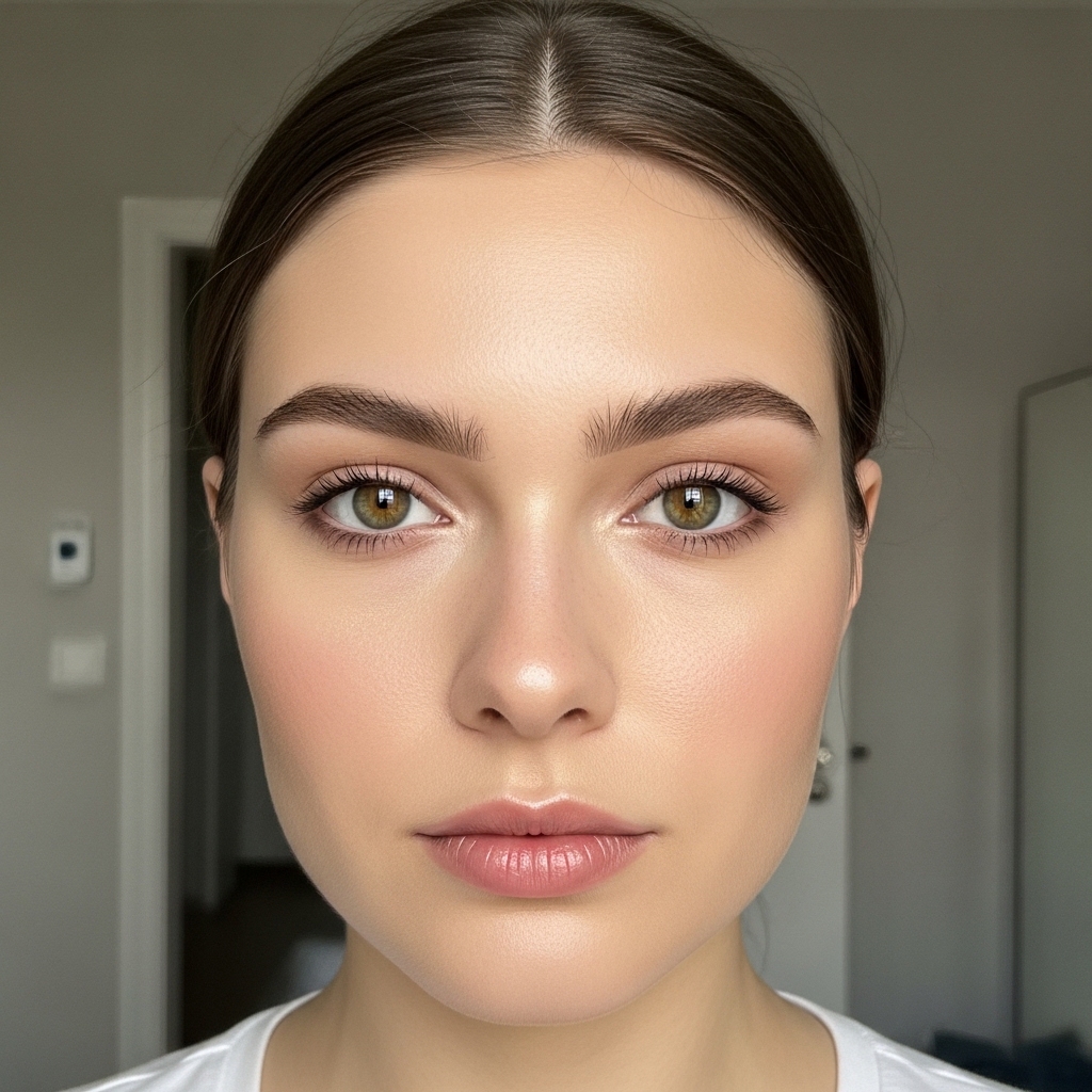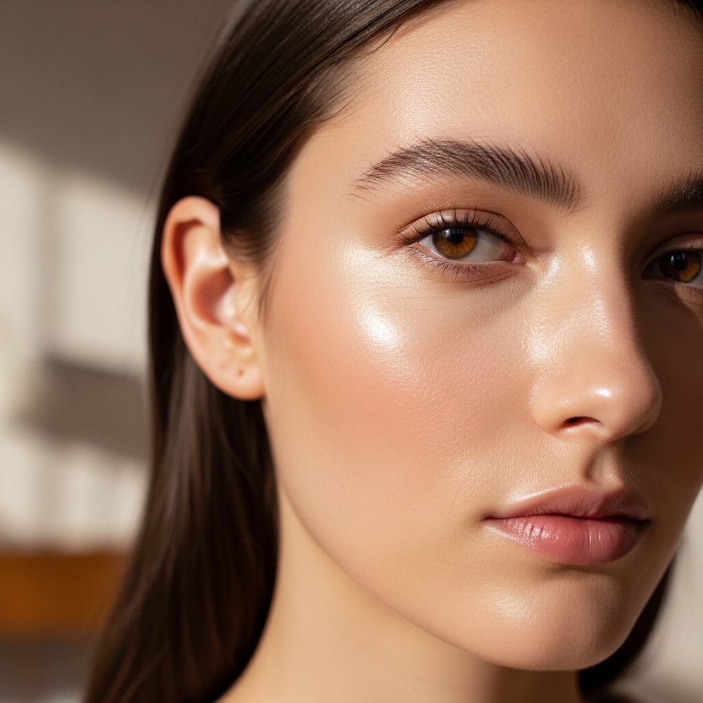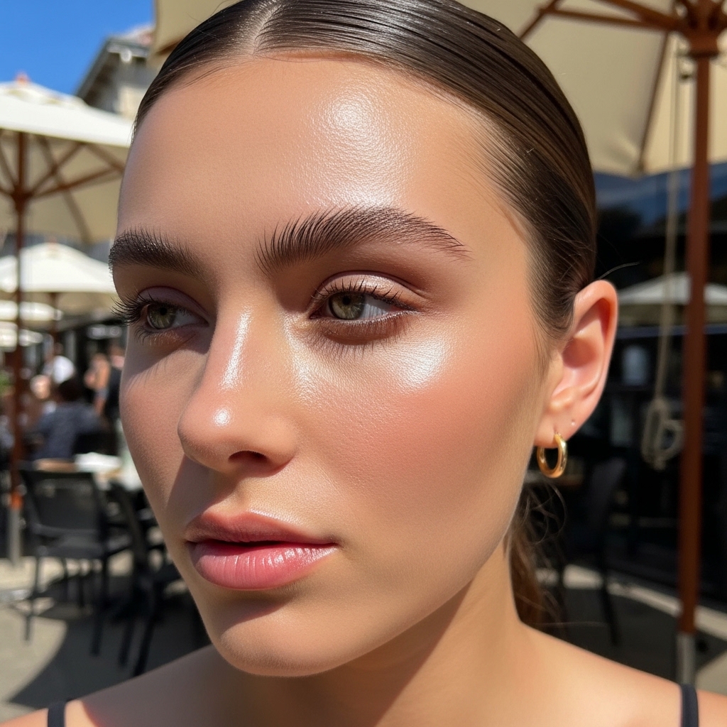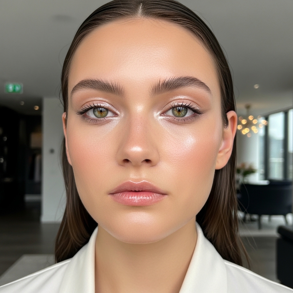This look centers on ultra-smooth, poreless skin paired with softly brushed-up brows that frame the face naturally. The base is created using hydrating primers, lightweight foundation, and strategic highlighting to mimic a reflective, glass-like finish. Brows are kept airy and lifted, adding structure without harsh lines.