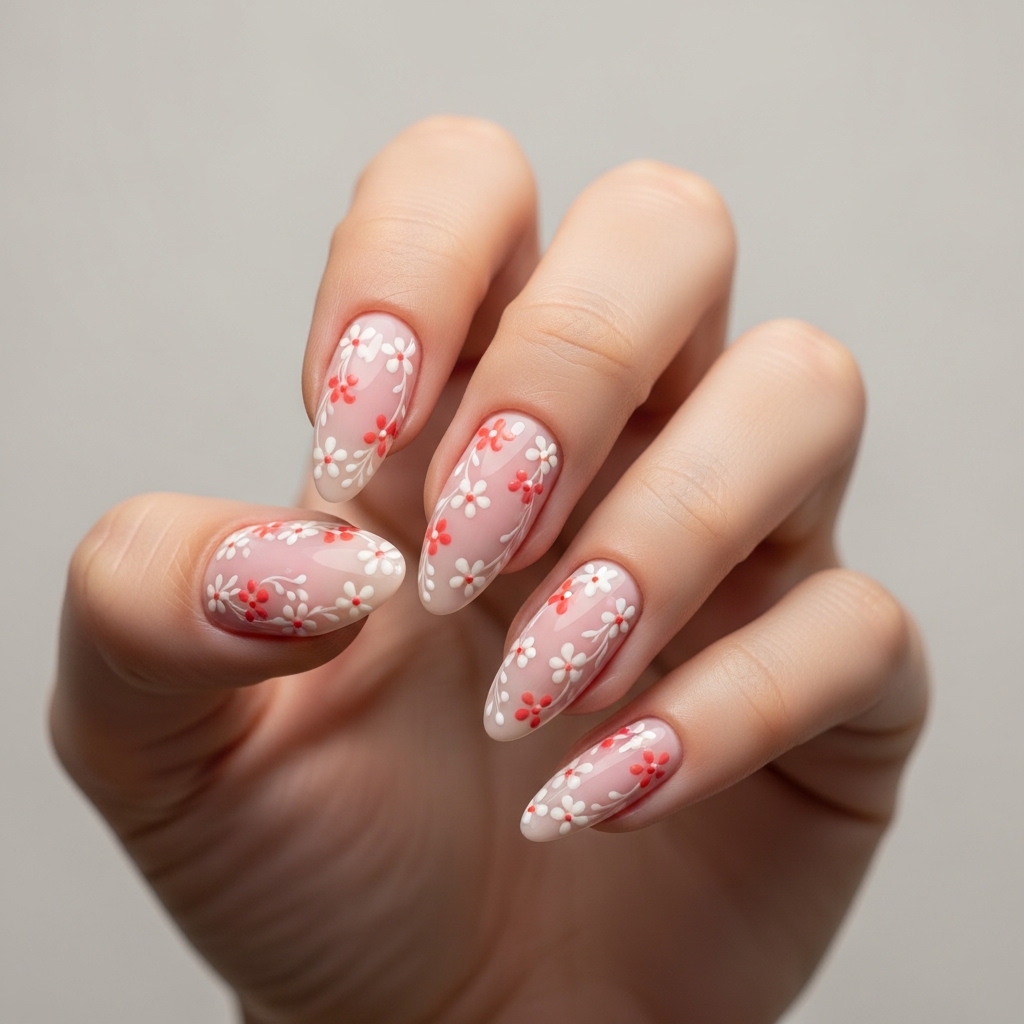 This design features a soft blush pink base layered with hand-painted micro florals in ivory and muted coral. The almond shape enhances the feminine aesthetic, giving the nails a naturally elongated look that feels delicate yet intentional. The subtle color palette makes it ideal for daytime events, bridal showers, or even professional settings where elegance is key.