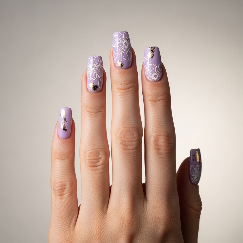 A glossy lavender base sets the tone for this chic square nail design, accented with delicate white floral outlines and subtle gold foil touches. The square shape adds a modern edge, making the look feel structured and contemporary while still embracing spring softness.