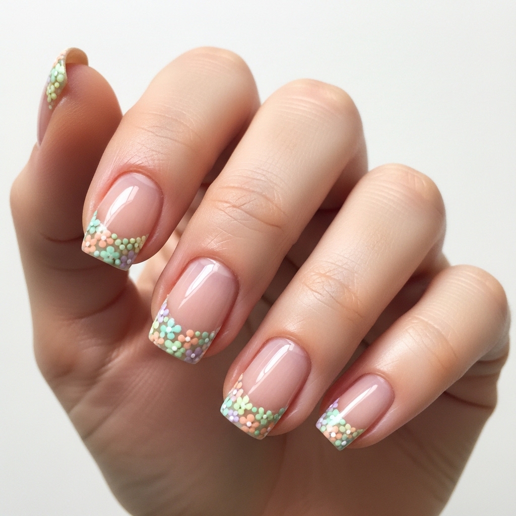 This elevated French tip design replaces classic white tips with pastel floral clusters in soft mint, peach, and lilac. The base remains sheer and natural, allowing the colorful tips to stand out while maintaining a clean and polished appearance.