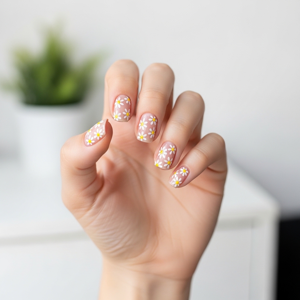 This design embraces a short, natural nail length with a clear or nude base adorned with tiny white daisies and yellow centers. It captures the carefree essence of spring while remaining highly wearable for everyday routines.