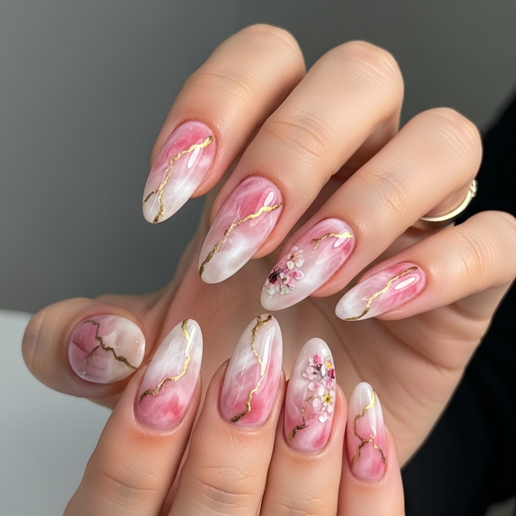 A luxurious blend of rose quartz marble textures with embedded floral accents creates a sophisticated and artistic nail design. Soft pink swirls are layered with translucent white and hints of gold veining, giving the nails a gemstone-inspired finish.