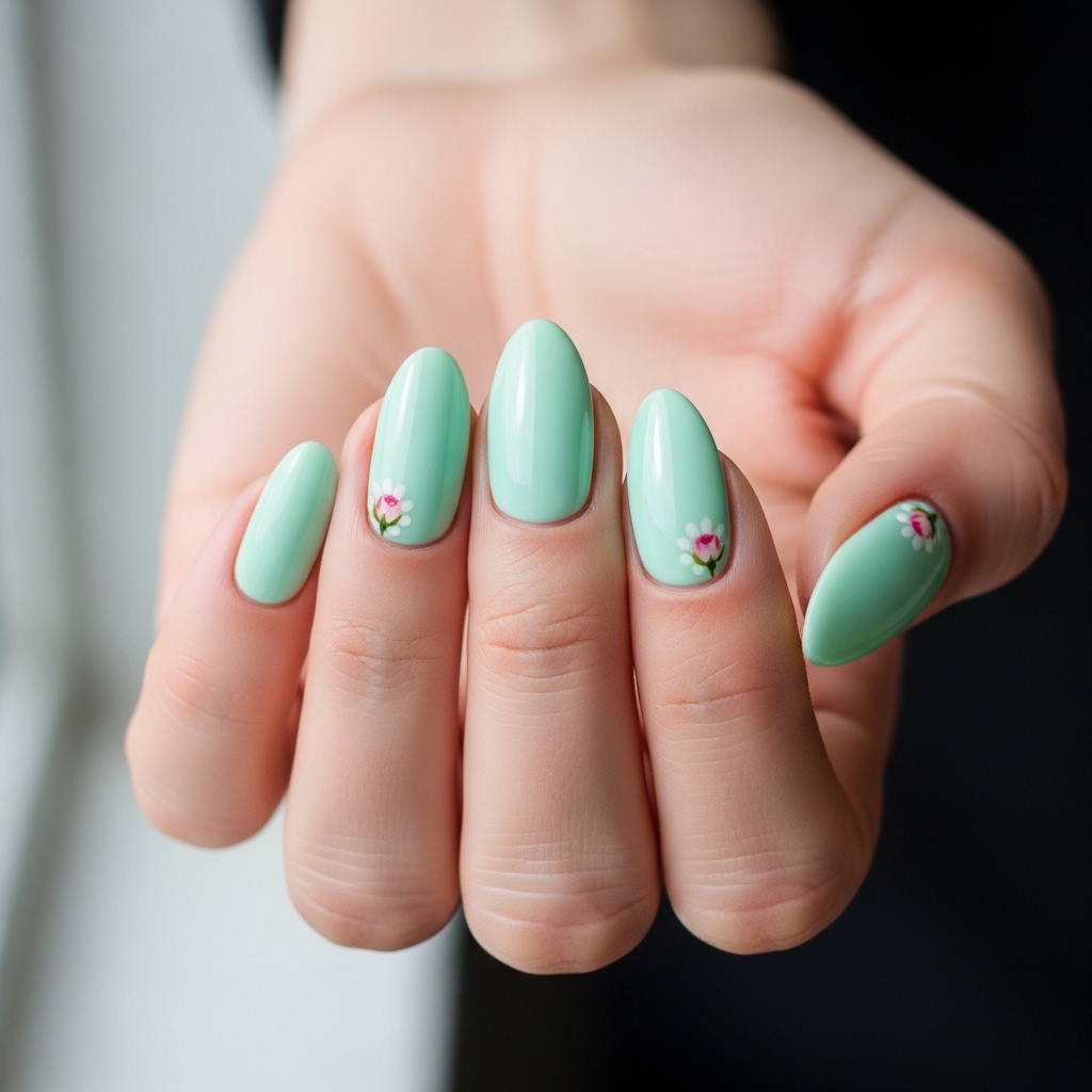 Featuring a muted mint green base with a single floral accent on each nail, this design leans into minimalist elegance. The oval shape enhances the softness, creating a clean and refined silhouette.