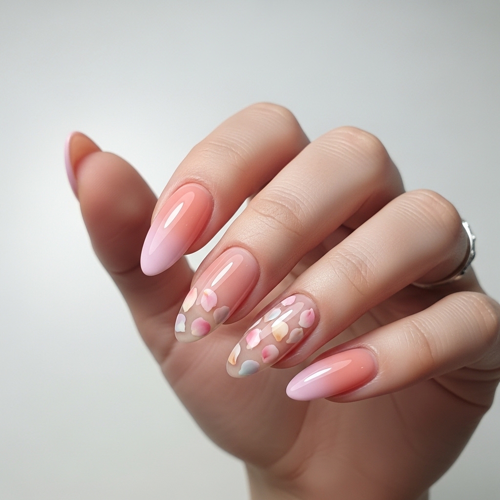 A gradient ombre effect transitions from soft peach to sheer pink, topped with delicate petal-like designs that mimic real blossoms. The seamless color blend adds depth while maintaining a light and airy feel.
