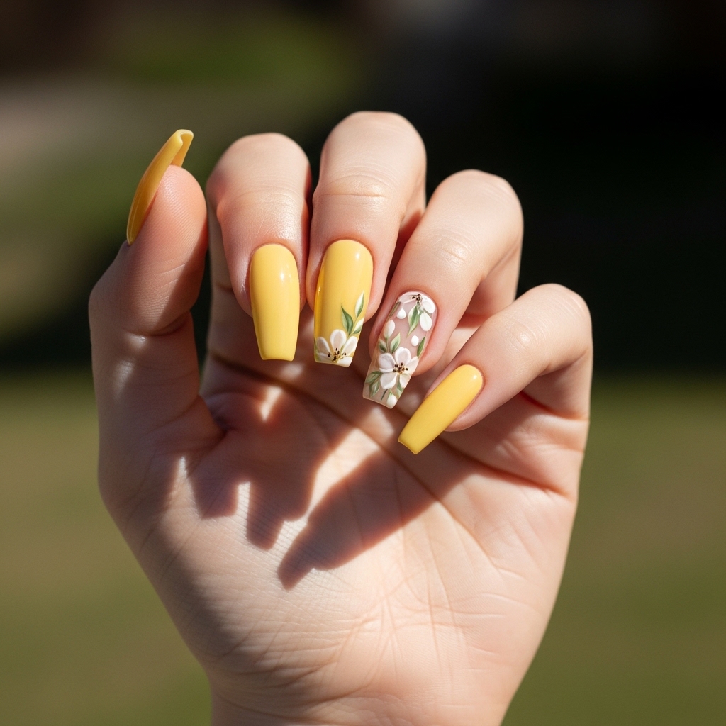 A creamy butter yellow base paired with accent nails featuring intricate floral illustrations creates a warm and inviting look. The coffin shape adds drama and length, making the design feel bold yet balanced.