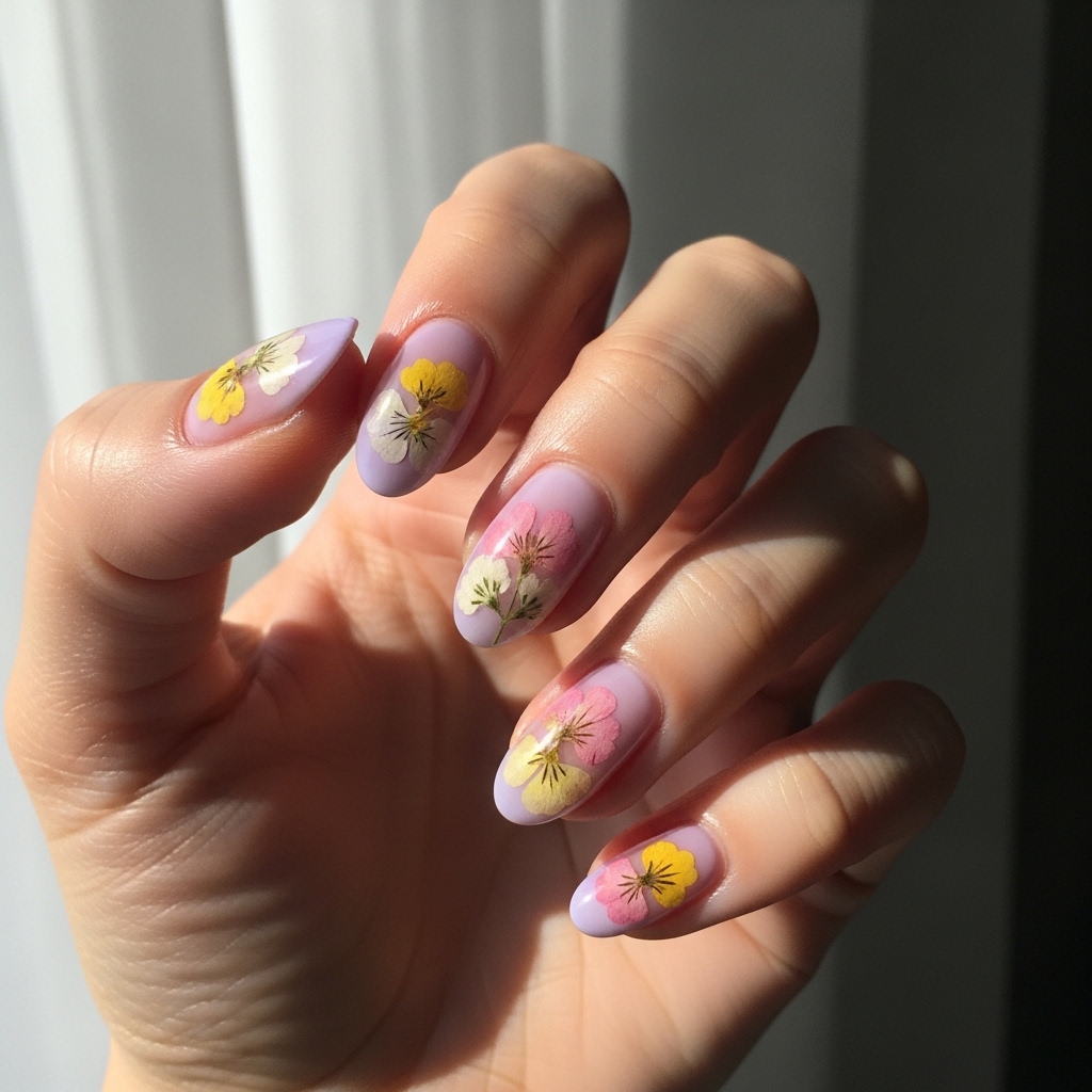 This ethereal design uses a sheer lilac base with embedded pressed flower elements, creating a delicate and almost translucent effect. The nails appear lightweight and artistic, resembling wearable botanical art.