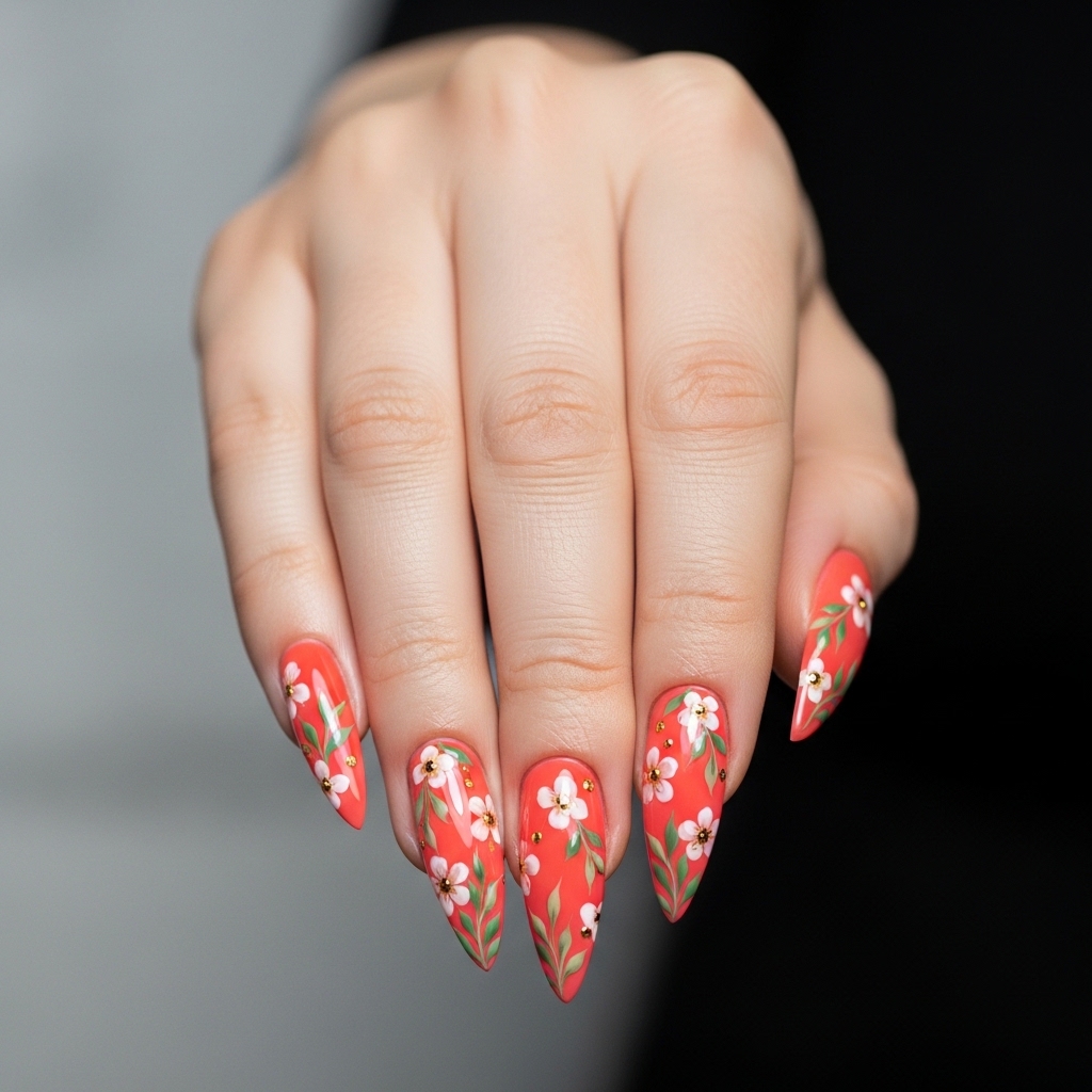 A vibrant coral base combined with ultra-fine floral micro art gives this stiletto design a bold yet refined look. The elongated shape enhances the dramatic effect while the intricate details keep it elegant.