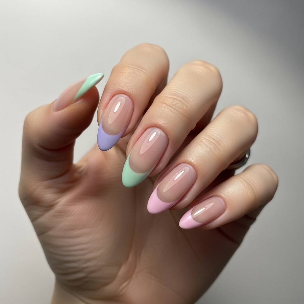 This design reimagines the classic French manicure by replacing traditional white tips with soft pastel shades like mint, lavender, and baby pink. The base remains sheer and glossy, allowing the colors to stand out without overwhelming the look. It is stylish because it blends timeless elegance with a modern seasonal update. Perfect for brunch dates or casual gatherings, it offers a polished appearance while still feeling light and playful. The simplicity ensures comfort, while the color palette keeps it aligned with current trends.