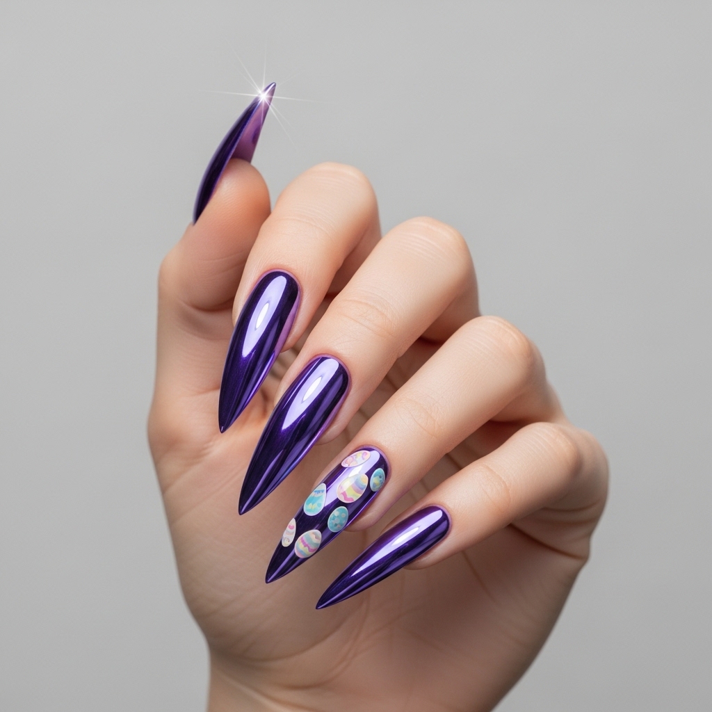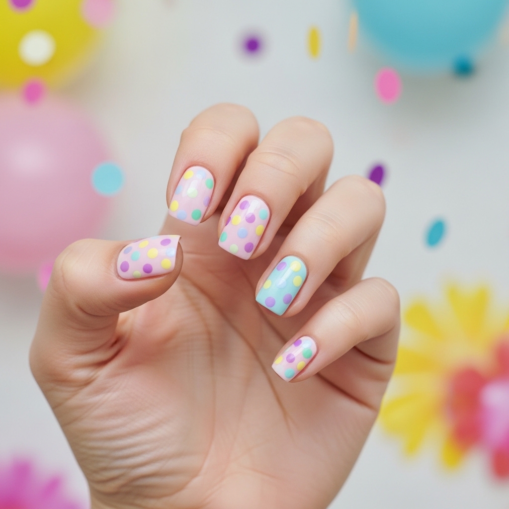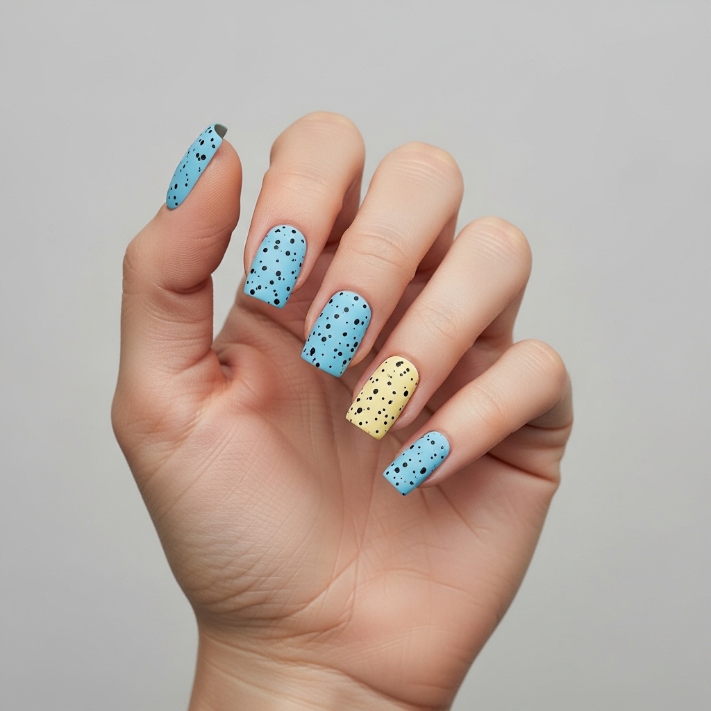 Inspired by Easter eggs, this design uses a matte pastel base with tiny speckled details layered on top. Shades like robin’s egg blue, soft yellow, and lilac work beautifully. The matte finish adds a modern touch, making the design feel fresh and unique. It is stylish because it captures seasonal inspiration in a refined way. Comfortable for everyday wear, it avoids heavy embellishments while still making a statement.